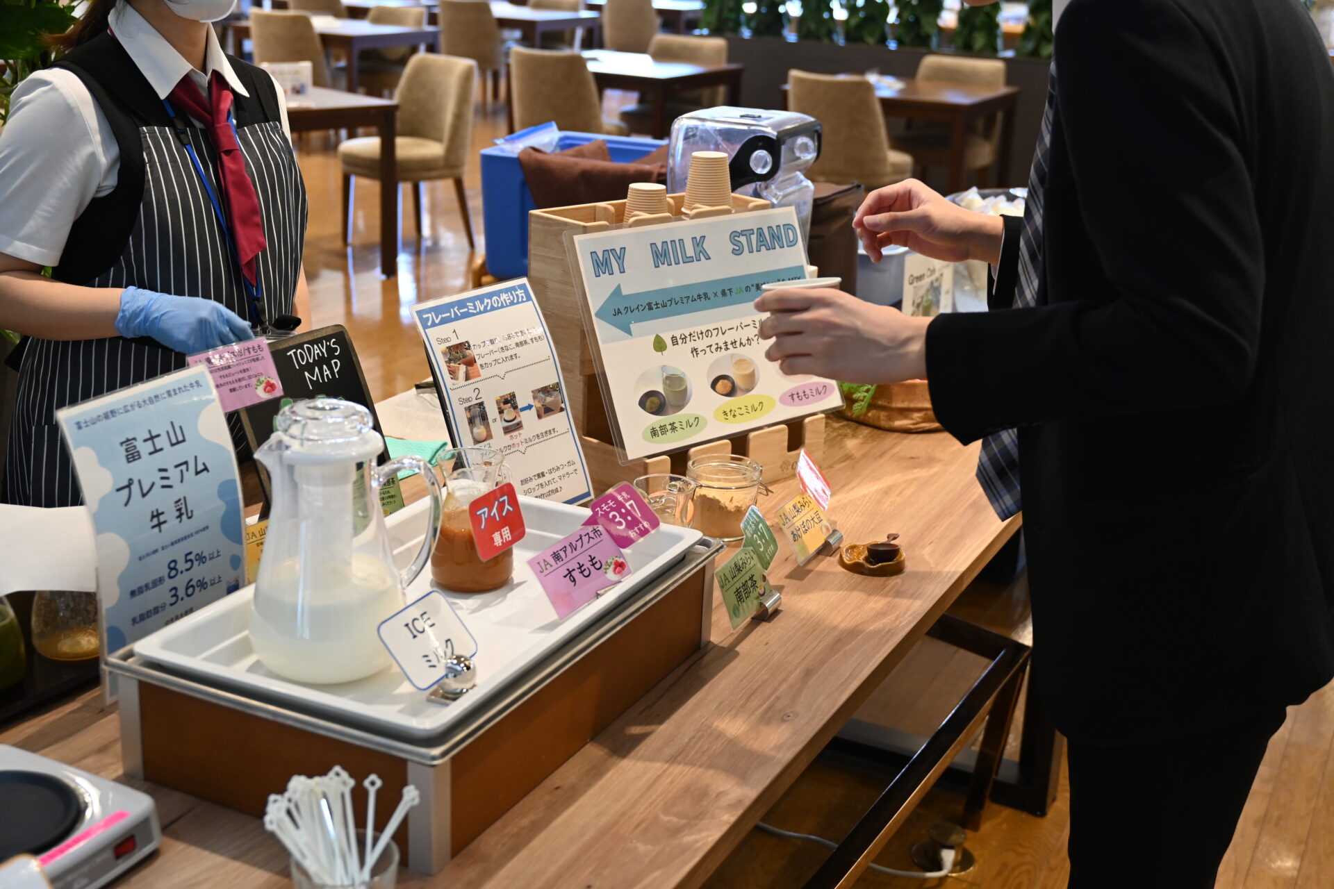 牛乳をそのまま味わっていただくこともできますが、MY MILK STANDでは、さまざまなフレーバーを自身のお好みでブレンドすることができます。もちろん、このフレーバーも県下JAの特産品を使用しています。それぞれの季節に合わせたフレーバーを提供予定ですので、人間ドックにお越しの際は山梨県の「おいしい」を集めたオリジナルの“MY  MILK”をお楽しみください!