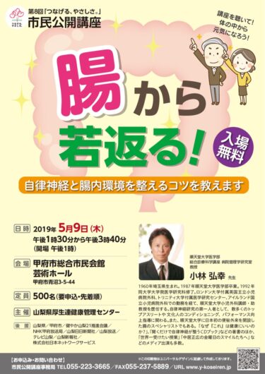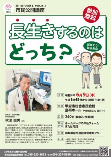 6月9日(木)甲府市総合市民会館芸術ホールにおいて、11回目となる市民公開講座を開催しました。 講師は医療法人社団双壽會秋津医院院長の秋津壽男先生です。先生は「医療の雑学王」とも呼ばれ、無理なくできる生活指導に定評があり […]