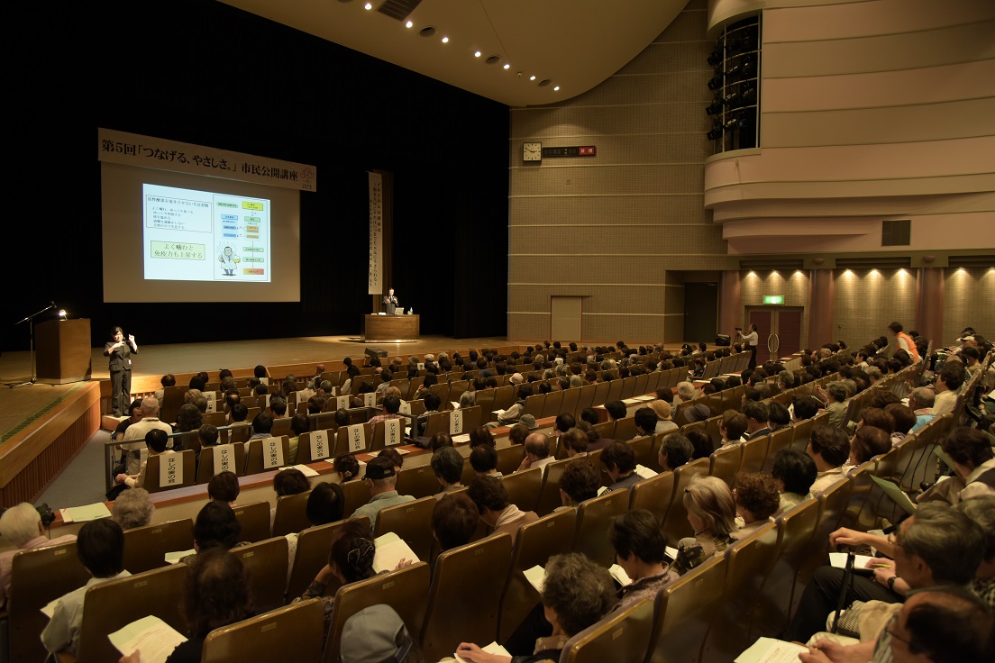 5月13日(金)に甲府市総合市民会館芸術ホールにおいて、5回目となる市民公開講座を開催しました。カイチュウ先生でおなじみの東京医科歯科大学名誉教授の藤田紘一郎先生を招き、「イキイキ長寿健康法~腸を大切にすればいつまでも元気に生きられる~」をテーマに講演していただきました。当日は満席となるほどの盛況ぶりで、「ユーモアあふれる話でとても楽しかった」「たくさん笑ったので免疫力が高まった」「腸を大切に長生きしたいと思った」などのうれしい声がたくさん寄せられました。