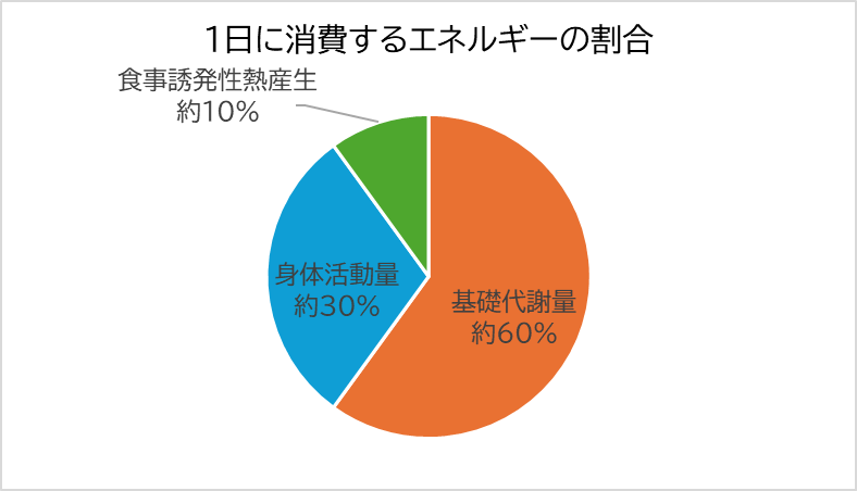 私たちの体は、眠っているときや安静にしているときでも体温を保つために、心臓を動かしたり呼吸することによってエネルギーを消費しています。このように心拍や呼吸、体温の維持など私たちが生きていくために最低限必要なエネルギー消費のことを基礎代謝といいます。1日あたりの総エネルギー消費量は基礎代謝量、身体活動量※1、食事誘発性熱産生※2で構成されています。内訳は基礎代謝量が約60%、身体活動量が約30%、食事誘発性熱産生が約10%です(図1参照)。下図のグラフからも分かるとおり基礎代謝量が最も大きな割合を占めているため、基礎代謝を高めることができれば消費エネルギー量を増やすことができ、ダイエットや健康管理に役立てることができます。