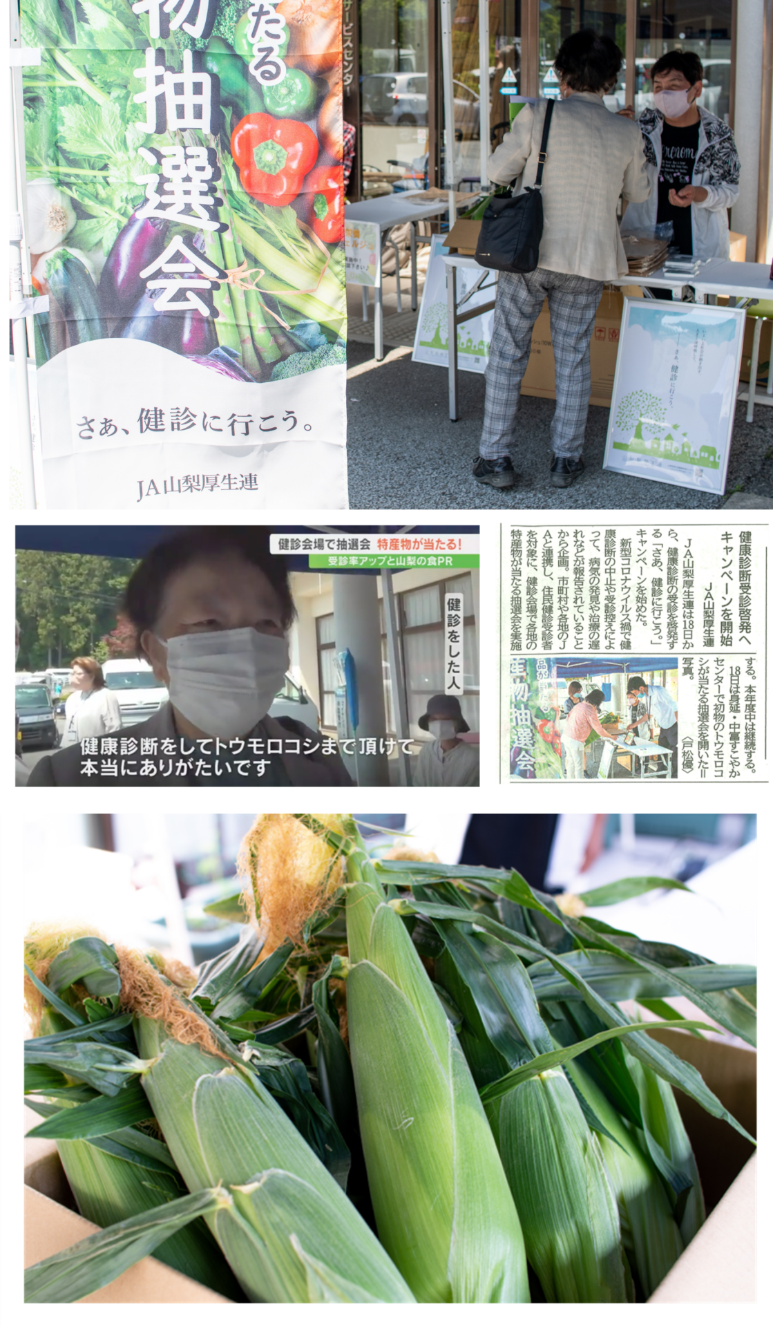 健康診断会場において、受診者を対象にした抽選会を開催しています。市町村やJAと連携した企画で、地元JAの新鮮な野菜や果物などが抽選で当たります。健診を受けて、美味しいものを当てちゃおう!