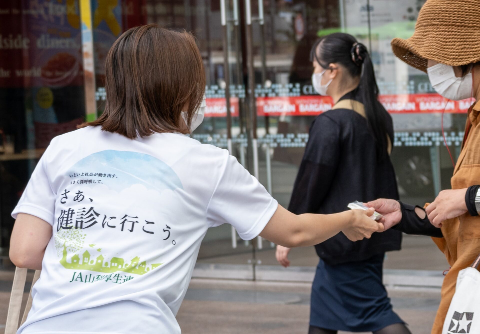 7月21日の朝、甲府駅南口の広場で健康診断の受診啓発の声掛けとティッシュ配りを実施しました!