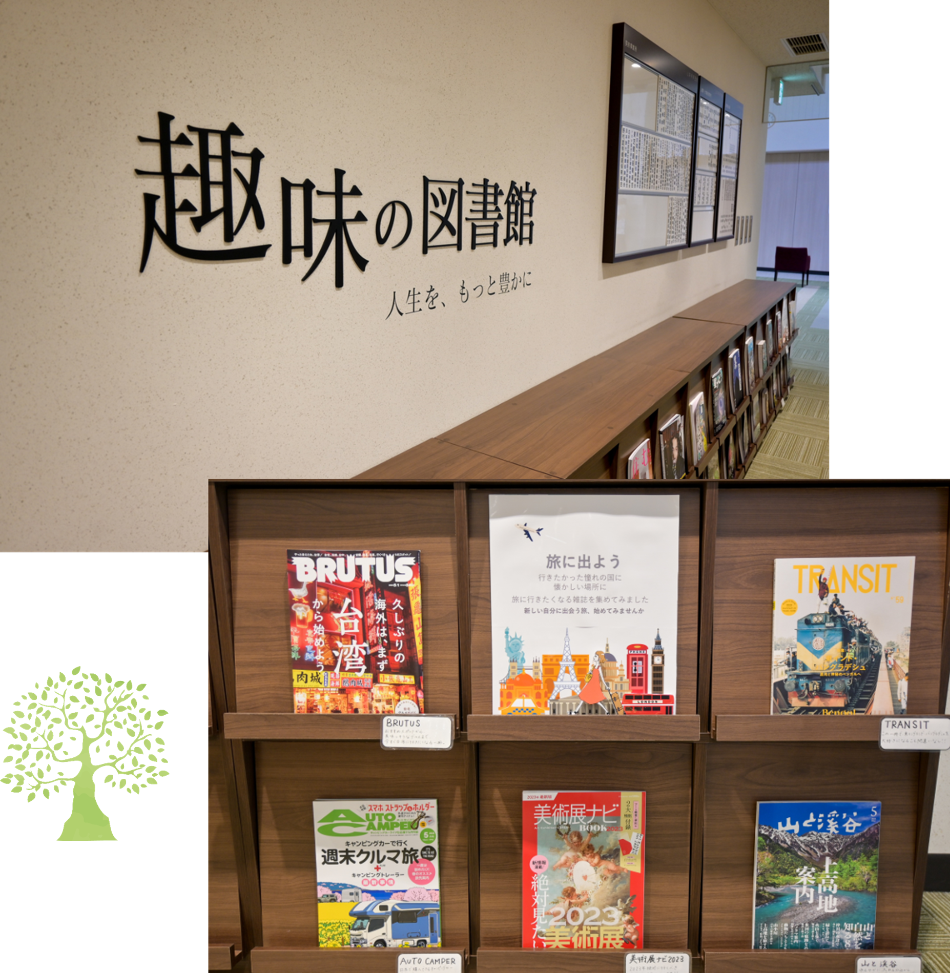 大好きな趣味と出会うことは、健康維持や健康増進のモチベーションを高めてくれます。人間ドックという機会を、そんな趣味との出会いの場にしたい。そんな思いから、趣味の本や雑誌に特化した図書館、「趣味の図書館」を当センター内にオープンしました。スポーツ、アウトドア、芸術、旅行など、数々の趣味と出会える書籍を取り揃えていますので、目にとまった本をぜひ手に取ってみてください。それがもしかしたら、生涯の趣味との出会いになるかもしれません。