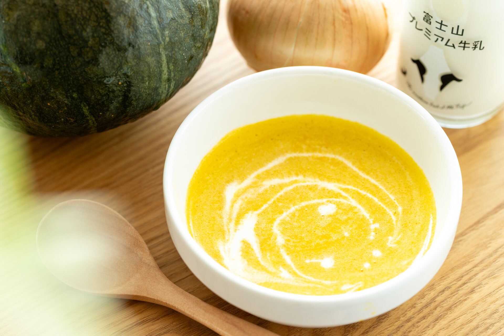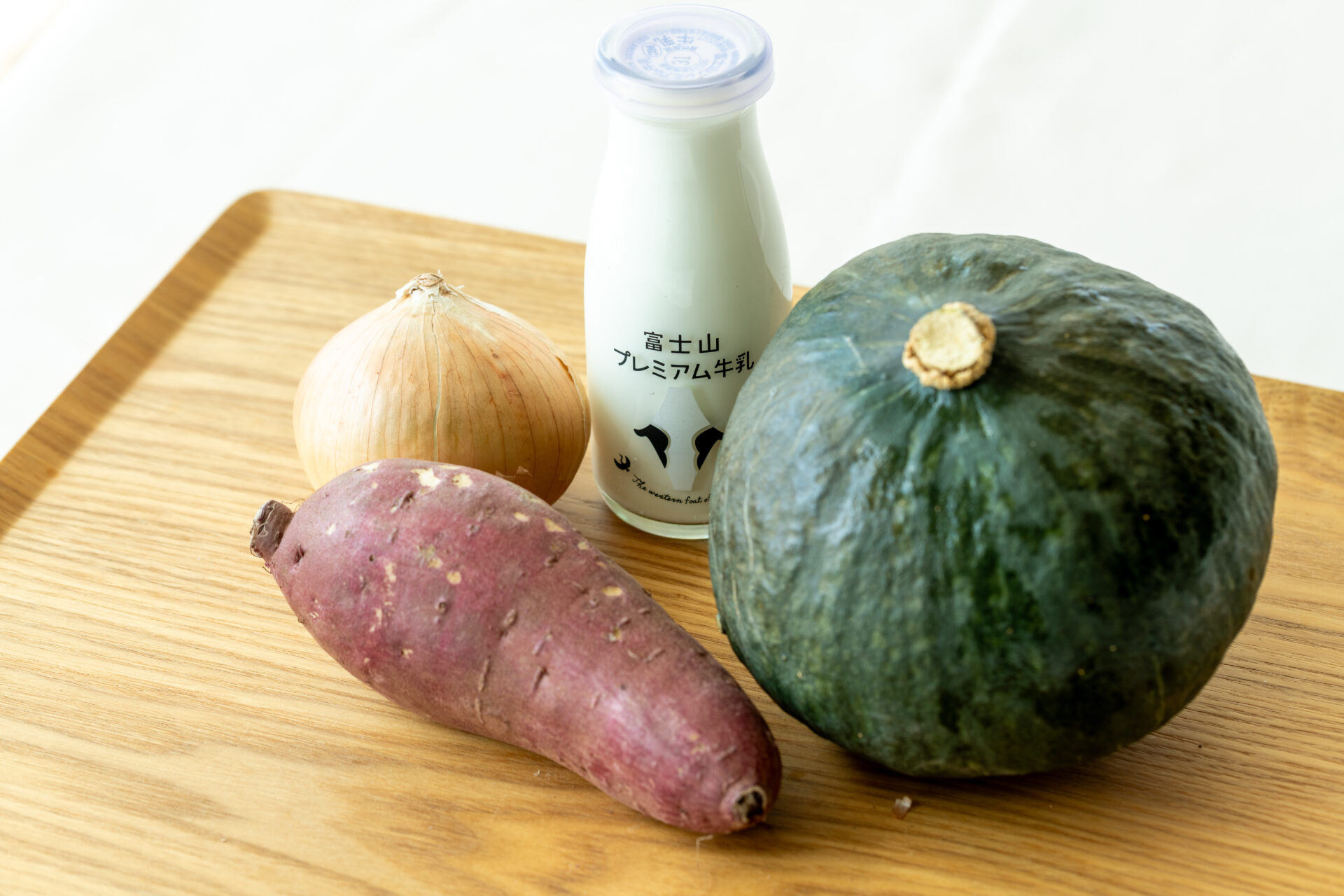 JAクレインが誇る「富士山プレミアム牛乳」とその時折で収穫できるJA自慢の旬の野菜を使用し、体にも心にも染み渡る優しい味わいに仕上げています。